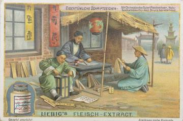 Reklamesammelbild (Liebig's Fleisch-Extract); polychrom Text: Alt-Chinesische Schriftschnitzer, Holzbuchstaben für den Druck herstellend Rückseite: Erläuterungstext zum Sammelbild, Werbetext zum Produkt