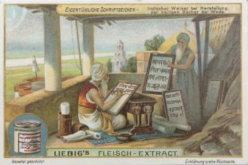 Reklamesammelbild (Liebig's Fleisch-Extract); polychrom Text: Indischer Weiser bei der Herstellung der heiligen Bücher der Weda Rückseite: Erläuterungstext zum Sammelbild, Werbetext zum Produkt