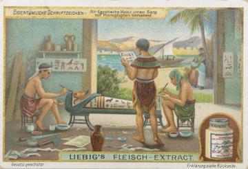 Reklamesammelbild (Liebig's Fleisch-Extract); polychrom Text: Alt-Ägyptische Maler einen Sarg mit Hieroglyphen bemalend Rückseite: Erläuterungstext zum Sammelbild, Werbetext zum Produkt