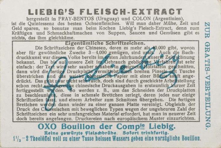 Reklamesammelbild (Liebig's Fleisch-Extract); polychrom Text: Alt-Chinesische Schriftschnitzer, Holzbuchstaben für den Druck herstellend Rückseite: Erläuterungstext zum Sammelbild, Werbetext zum Produkt