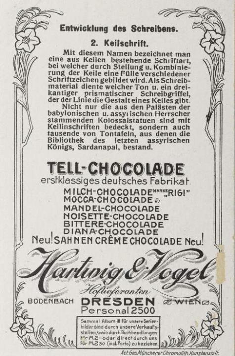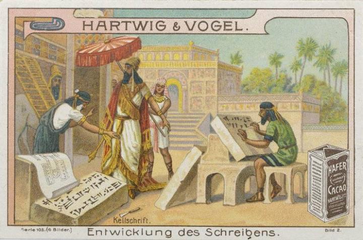 Reklamesammelbild (Tell-Cacao); polychrom Serie 103, Bild 2. Sumerische Keilschrift Rückseite: Erläuterungstext zum Sammelbild, Werbetext zum Produkt