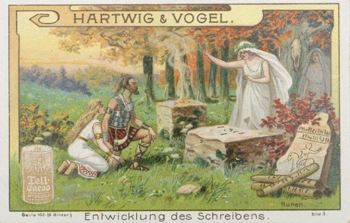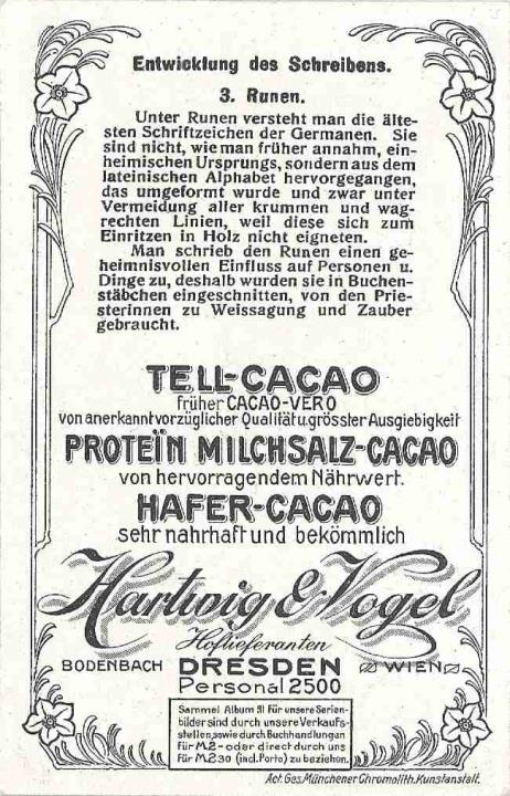 Reklamesammelbild (Tell-Cacao); polychrom Serie 103, Bild 3. Germanische Runen Rückseite: Erläuterungstext zum Sammelbild, Werbetext zum Produkt