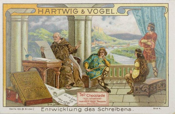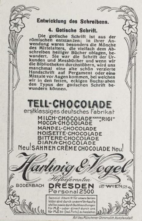 Reklamesammelbild (Tell-Cacao); polychrom Serie 103, Bild 4. Gotische Schrift Rückseite: Erläuterungstext zum Sammelbild, Werbetext zum Produkt