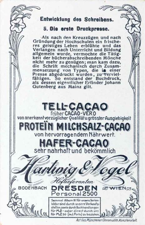 Reklamesammelbild (Tell-Cacao); polychrom Serie 103, Bild 5. Die erste Druckpresse Rückseite: Erläuterungstext zum Sammelbild, Werbetext zum Produkt