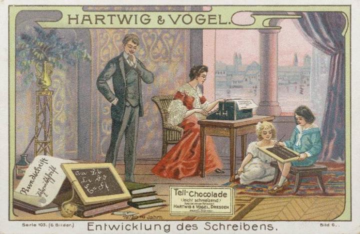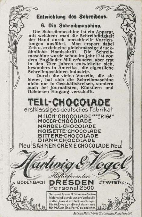 Reklamesammelbild (Tell-Cacao); polychrom Serie 103, Bild 6. Die Schreibmaschine Rückseite: Erläuterungstext zum Sammelbild, Werbetext zum Produkt