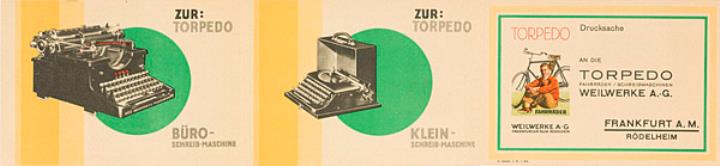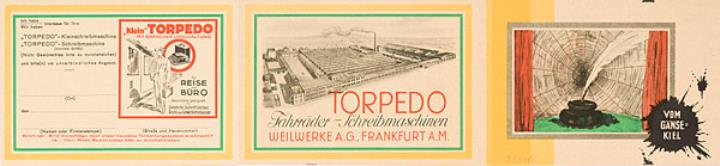 Antwortpostkarte / Faltprospekt für Schreibmaschine Torpedo; Nr. F.10031.1.M.1.28 Antwortkarte mit Werbebild: sitzender Mann mit Pfeife und Fahrrad, Mann mit Kofferschreibmaschine neben Zug