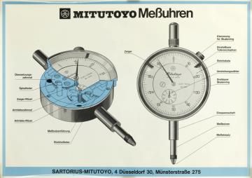 Schautafel mit technischer Zeichnung zu Bestandteilen der Messuhr Mitutoyo Papier plastifiziert