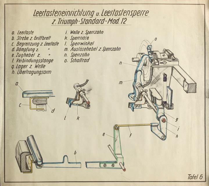 handkolorierte technische Detailzeichnung zu Leertasteneinrichtung und -sperre der Schreibmaschine Triumph Standard 12