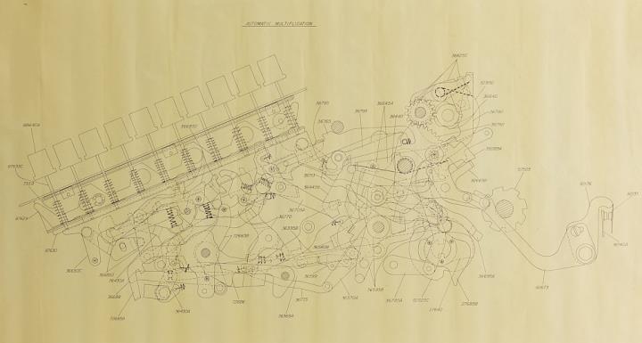 großformatige technische Zeichnung der Multiplikationseinrichtung einer nicht spezifizierten Rechenmaschine (möglicherweise Monroe)