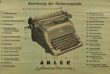 Aufrollbare Wandkarte mit Darstellung der Schreibmaschine Adler Universal Papier mit Baumwollgewebe verstärkt, mit Holzleisten und Aufhängeschnur