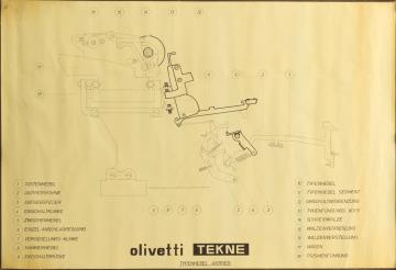 großformatige technische Detailzeichnung zu Typenhebelantrieb der Schreibmaschine Olivetti Tekne 3
