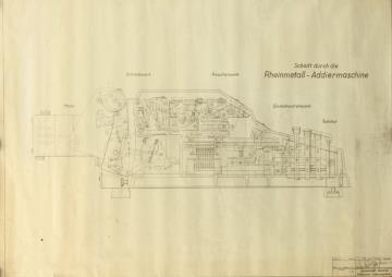 großformatige technische Detailzeichnung, Längsschnitt durch Addiermaschine Rheinmetall Masstab 2:1; Entwurf: 9.3.35, Bastian