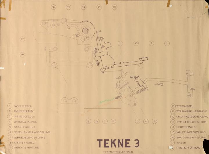 großformatige technische Detailzeichnung zu Typenhebelantrieb der Schreibmaschine Olivetti Tekne 3
