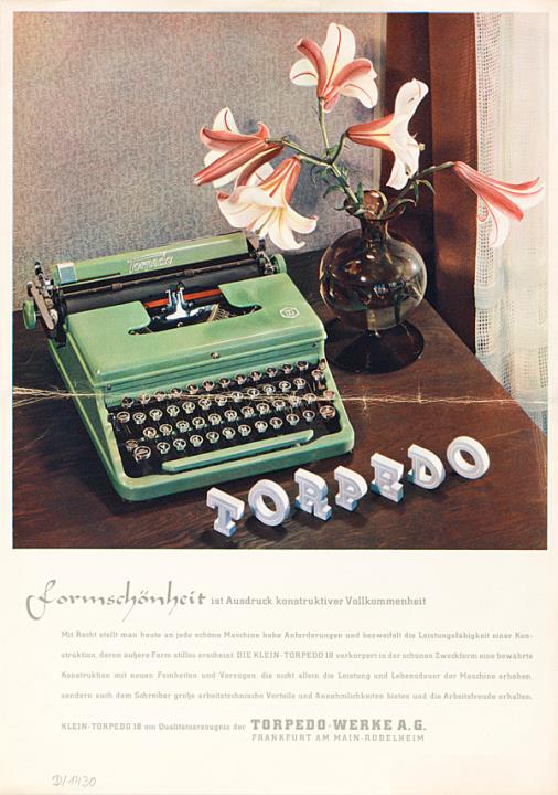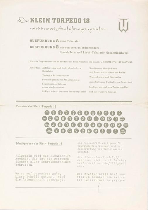 Prospekt für Schreibmaschine Torpedo 18 Formschönheit ist Ausdruck konstruktiver Vollkommenheit mit Tastaturansicht und Schriftproben