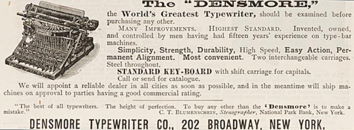 Werbeanzeige für Schreibmaschine Densmore monochrom