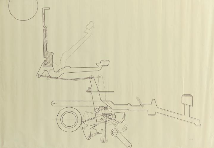 großformatige technische Detailzeichnung zu Typenhebelwerk einer nicht spezifizierten Schreibmaschine (vermutlich Adler electric) datiert 13 VI 56, signiert