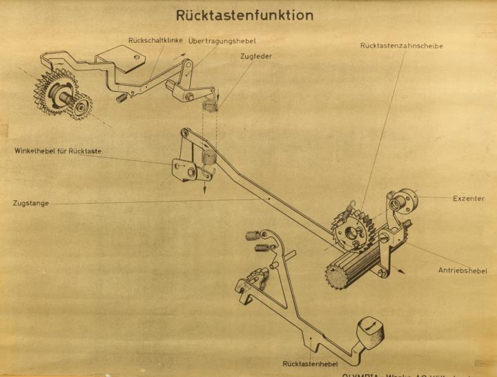 Aufrollbare Wandkarte mit technischer Detailzeichnung zu Schreibmaschine Olympia SGE Papier mit Baumwollgewebe verstärkt, mit Holzleisten und Aufhängeschnur