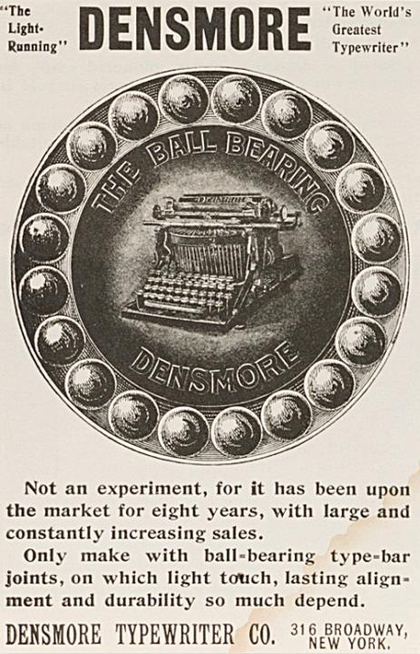 Werbeanzeige für Schreibmaschine Densmore mit Typenhebel-Kugellager monochrom