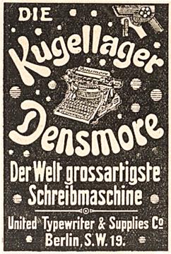 Werbeanzeige für Schreibmaschine Densmore mit Typenhebel-Kugellager monochrom