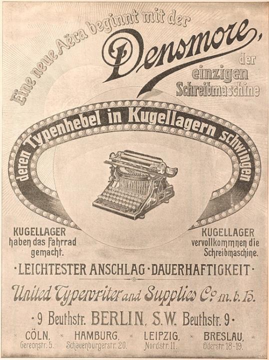 Werbeanzeige für Schreibmaschine Densmore mit Typenhebel-Kugellager monochrom
