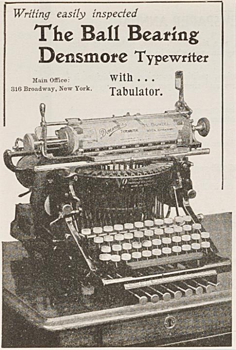 Werbeanzeige für Schreibmaschine Densmore mit Typenhebel-Kugellager monochrom