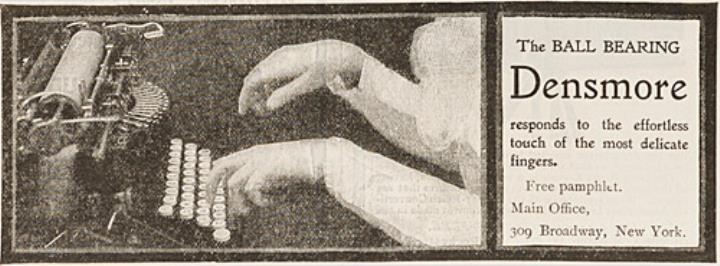 Werbeanzeige für Schreibmaschine Densmore mit Typenhebel-Kugellager monochrom