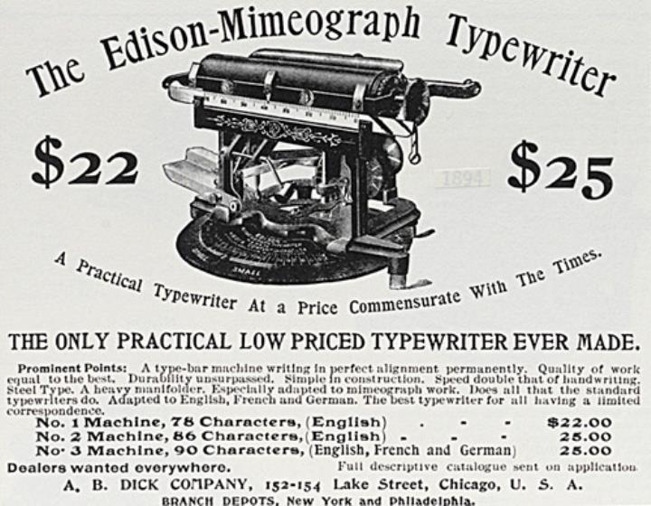Werbeanzeige für Schreibmaschine Edison Mimeograph monochrom