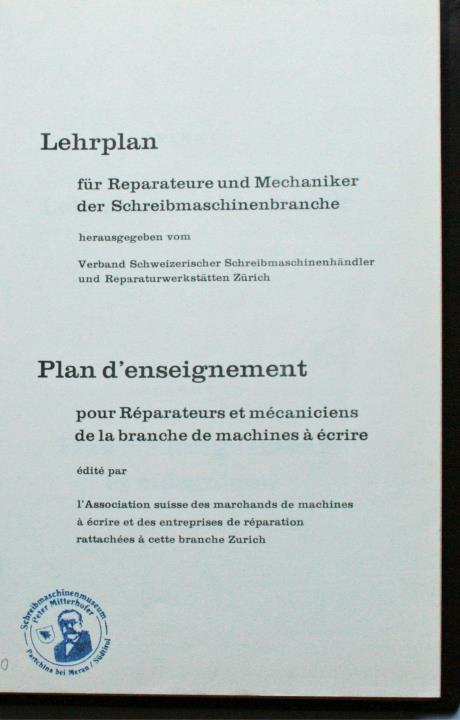 zweiteiliger Lehrplan in deutscher und französischer Sprache Band I: Lehrplan und Mechanik Band II: Die Schreibmaschine und ihre Funktionen Beilage: Reglemente über die Lehrlingsausbildung und die Mindestanforderungen der Lehrabschlussprüfung im Berufe des Schreibmaschinenreparateurs