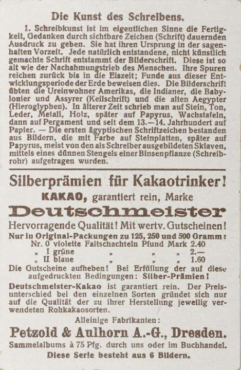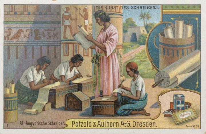 Reklamesammelbild (Petzold & Aulhorn); polychrom Serie 31, Bild 1. Alt-Aegyptische Schreiber Rückseite: Erläuterungstext zum Sammelbild, Werbetext zum Produkt