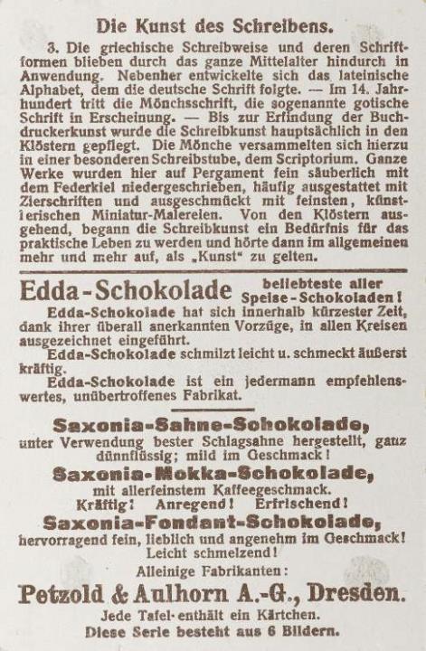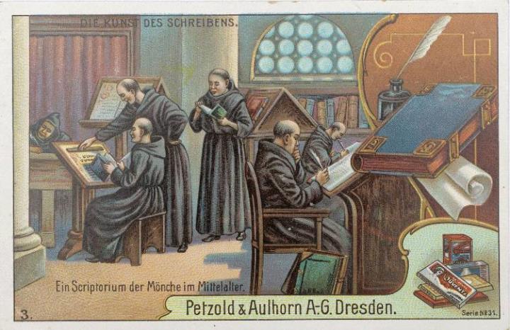 Reklamesammelbild (Petzold & Aulhorn); polychrom Serie 31, Bild 3. Ein Skriptorium der Mönche im Mittelalter Rückseite: Erläuterungstext zum Sammelbild, Werbetext zum Produkt