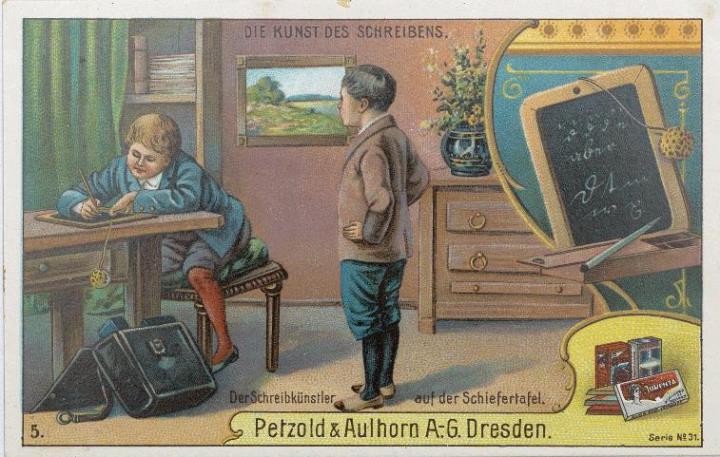 Reklamesammelbild (Petzold & Aulhorn); polychrom Serie 31, Bild 5. Der Schreibkünstler auf der Schiefertafel Rückseite: Erläuterungstext zum Sammelbild, Werbetext zum Produkt