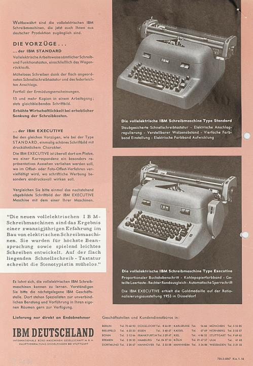 Prospekt für Schreibmaschine IBM electric Standard und Executive Nr. 724-3-4847 Kie. 1.54