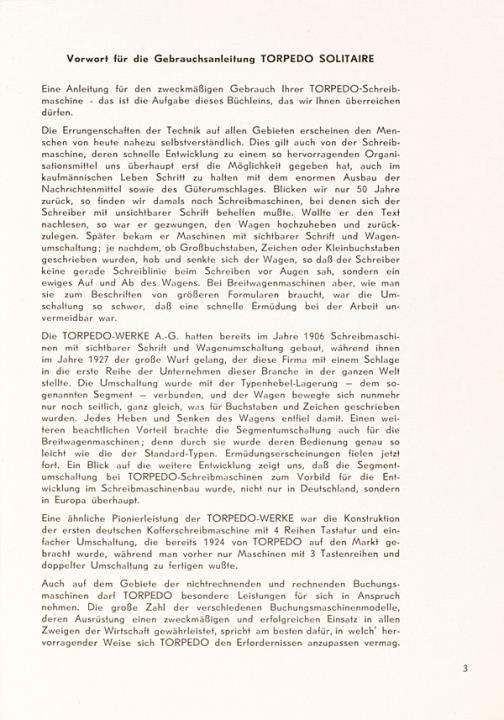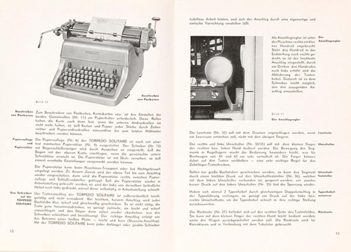 Bedienungsanleitung für Schreibmaschine Torpedo Solitaire Nr. d109-12-155 Datum handschriftlich auf Anleitung vermerkt