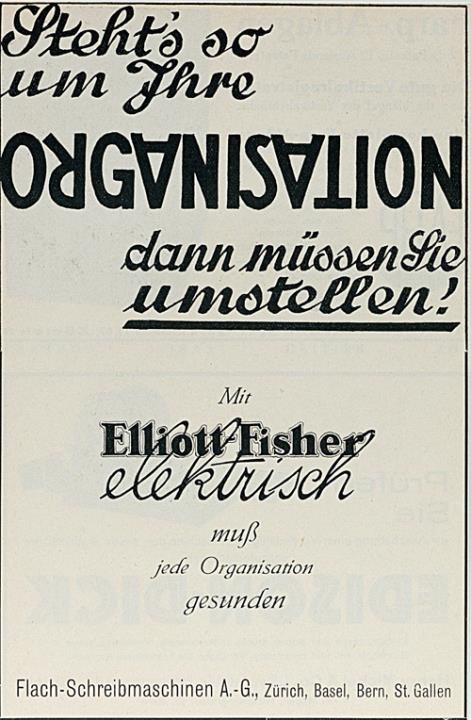 Werbeanzeige für elektrische Buch-Schreibmaschine Elliott-Fisher monochrom