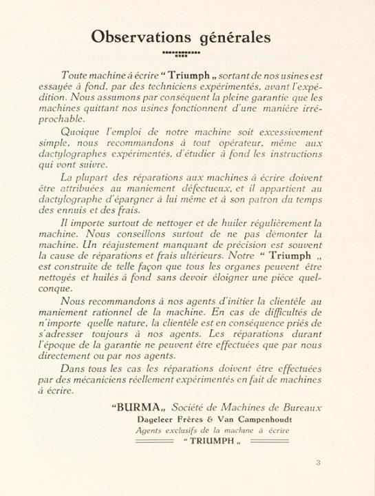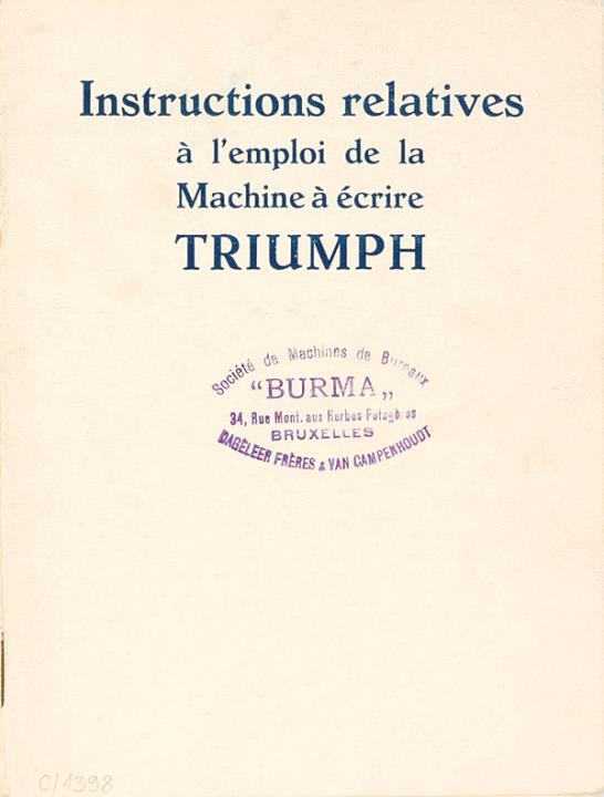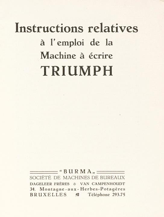 Bedienungsanleitung in französischer Sprache für Schreibmaschine Triumph 1 angebrachter Stempel der Büromaschinenhandlung Burma, Brüssel