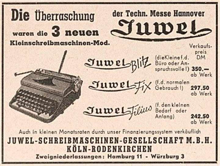 Werbeanzeige für Schreibmaschine Juwel monochrom