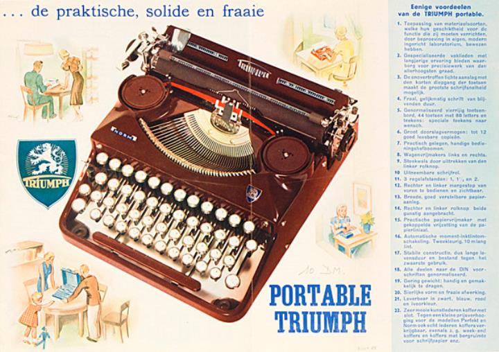 Next to literature on the history of technology, of the typewriter and the office, the Archive holds patent letters, textbooks and instruction manuals as well as historical postcards, letters, photographs and various kinds of advertising (leaflets and brochures, advertising stamps, newspaper ads, posters and signs, promotional gifts).