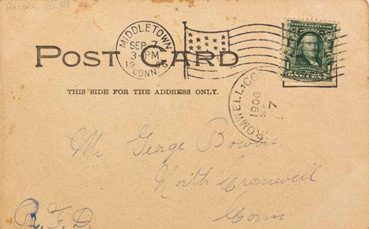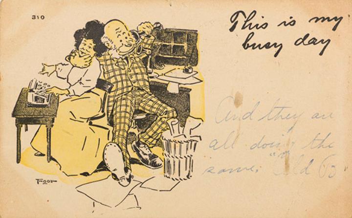Illustrierte Postkarte; Grafik, polychrom; Nr. 310 Rückseite: Vorgesetzter und Sekretärin mit Schreibmaschine in romantischer Büroszene, Leerraum beschrieben; Vorderseite: adressiert an Mr. Bowers, North Cromwell; Briefmarke U.S. Postage One Cent; Poststempel Middletown/Sep 7 1906