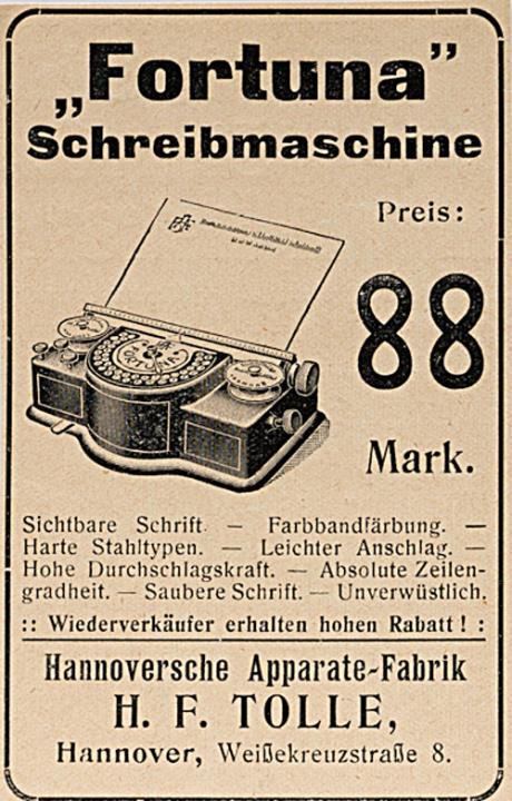 Werbeanzeige für Indexschreibmaschine Fortuna monochrom