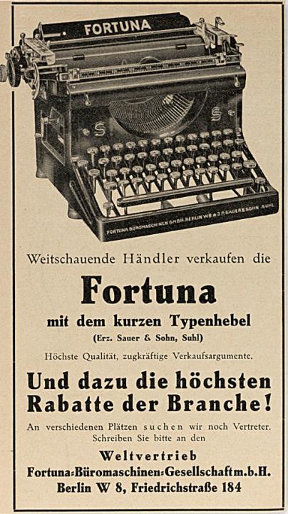 Werbeanzeige für Schreibmaschine Fortuna monochrom