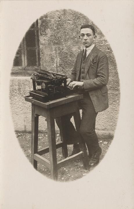 Illustrierte Postkarte; Fotografie, monochrom Rückseite: Aufnahme im Freien; junger Mann mit Schreibmaschine Vorderseite nicht beschrieben
