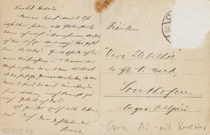 Illustrierte Postkarte; Fotografie, monochrom Rückseite: fünf Männer/Büromitarbeiter posieren für ein Gruppenbild; Tisch mit Schreibmaschine Kanzler, Wand mit Werbeschildern (Pereat, Zuban) Vorderseite: beschrieben; adressiert an Fräulein Zlebelhör, Sonthofen