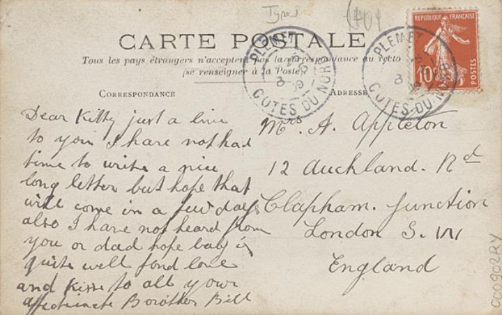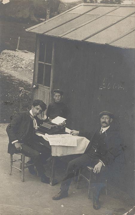 Illustrierte Postkarte; Fotografie, monochrom Rückseite: Aufnahme im Freien; zwei Männer und ein Junge vor einer Hütte posierend, Tisch mit Schreibmaschine und Tageszeitung Vorderseite: beschrieben; adressiert an Mrs. Appleton, London; Briefmarke Postes Francaises 10c; Briefmarke Plemet/8.6.1909
