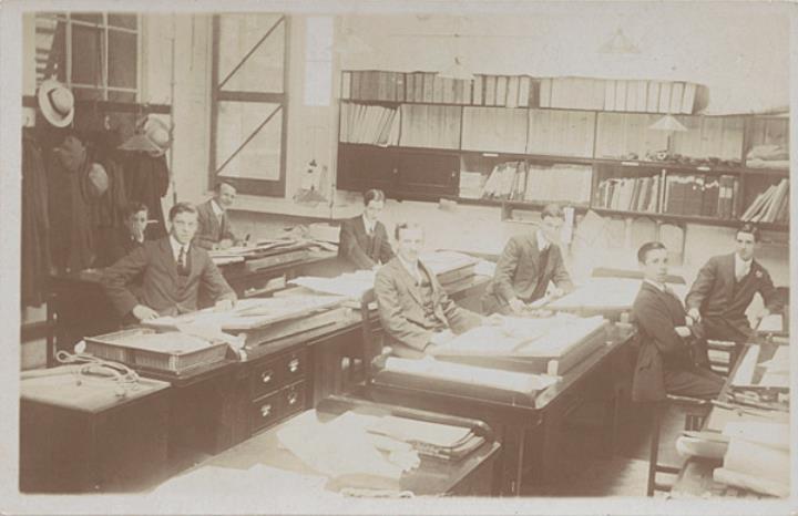 Illustrierte Postkarte; Fotografie, monochrom Rückseite: Mitarbeiter eines Büros posieren für ein Gruppenbild Vorderseite mit handschriftlichem Vermerk: Office scene c 1910