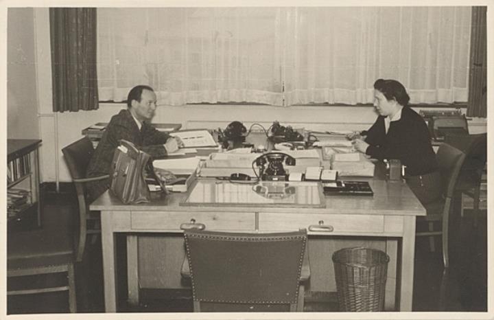 Illustrierte Postkarte; Fotografie, monochrom Rückseite: Büroansicht; Mann und Frau an Schreibtischen mit Telefon, im Hintergrund eine Schreibmaschine Vorderseite nicht beschrieben