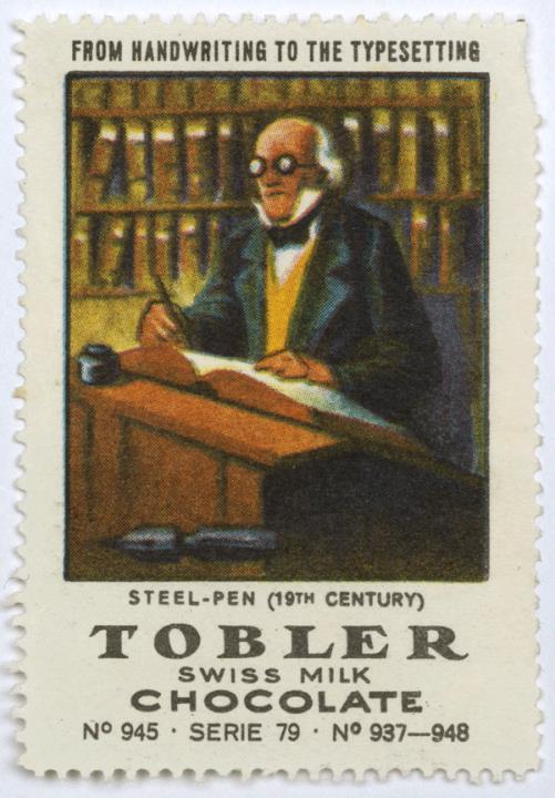 Reklamemarke/Werbemarke einer Serie (Tobler Schokolade); rechteckig, polychrom Serie 79, Nr. 945. Steel-Pen (19th Century)