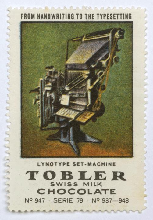 Reklamemarke/Werbemarke einer Serie (Tobler Schokolade); rechteckig, polychrom Serie 79, Nr. 947. Lynotype Set-Machine