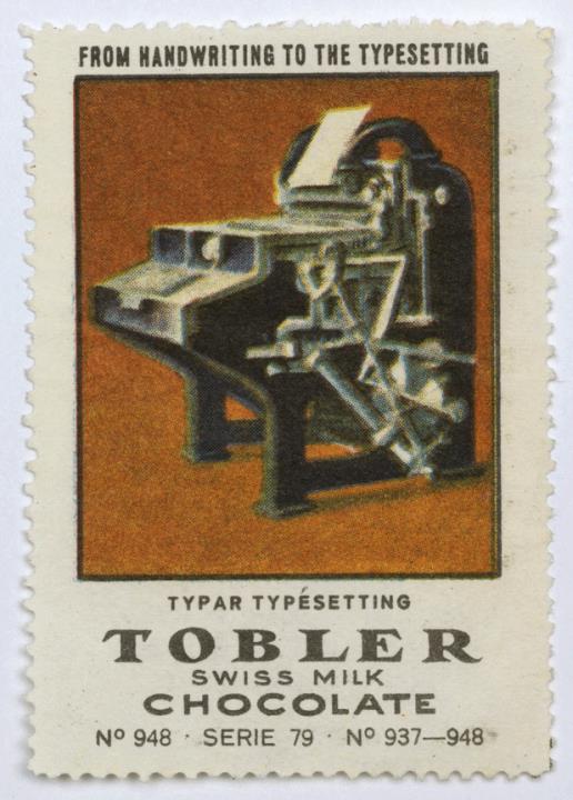 Reklamemarke/Werbemarke einer Serie (Tobler Schokolade); rechteckig, polychrom Serie 79, Nr. 948. Typar Typesetting