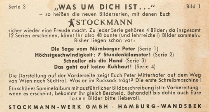Reklamesammelbild (Stockmann); polychrom Serie 3, Bild 1. Peter Mitterhofer auf dem Weg von Wien nach Südtirol Rückseite: Erläuterungstext zum Sammelbild
