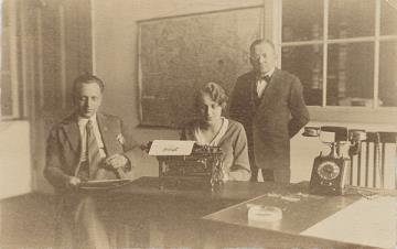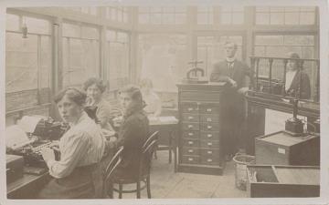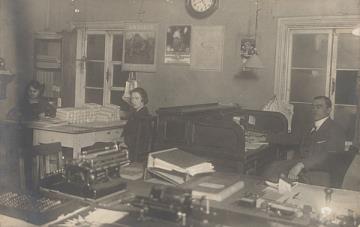 Illustrierte Postkarte; Fotografie, monochrom Rückseite: Büroansicht; Vorgesetzter und drei Mitarbeiterinnen posieren für ein Gruppenbild, Tisch mit Schreibmaschine und Telefon Vorderseite beschrieben: [...] Büro Kustermann München 1921